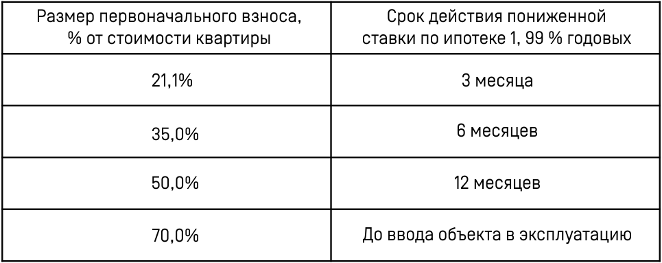В период с 11 ноября 2023 г. по 31 декабря 2023 г. покупатель вправе получить ипотеку под 1,99% годовых в банке-партнёре ПAO «Совкомбанк» сроком от 3 месяцев или до ввода объекта в эксплуатации в зависимости от размера первоначального взноса.